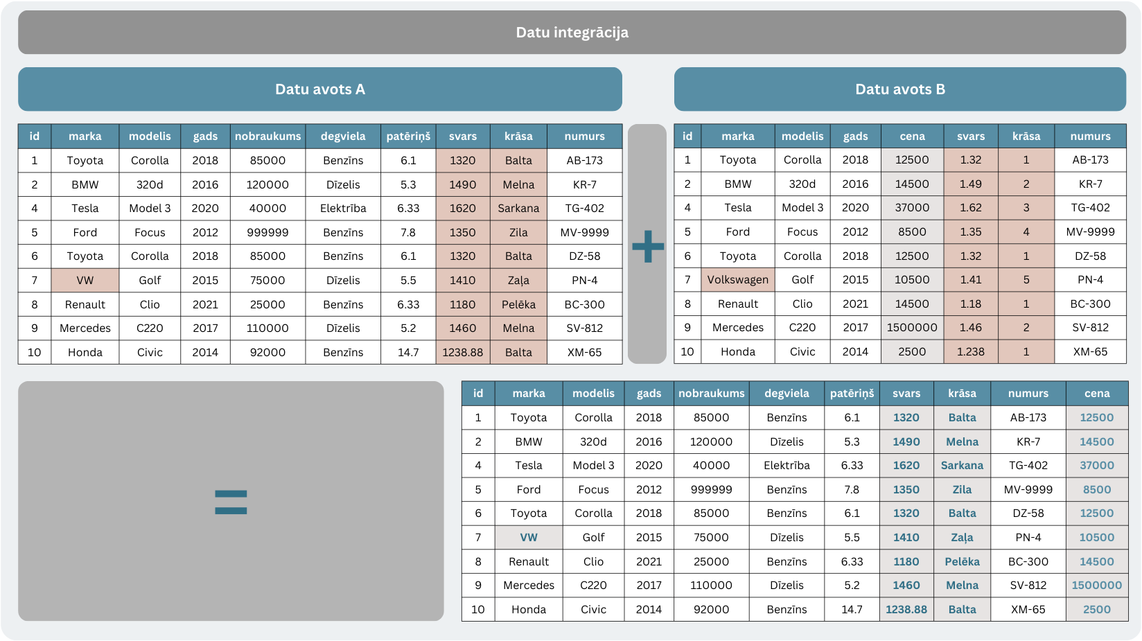 datu integrācija – datu apvienošana no dažādiem avotiem vienotā struktūrā;