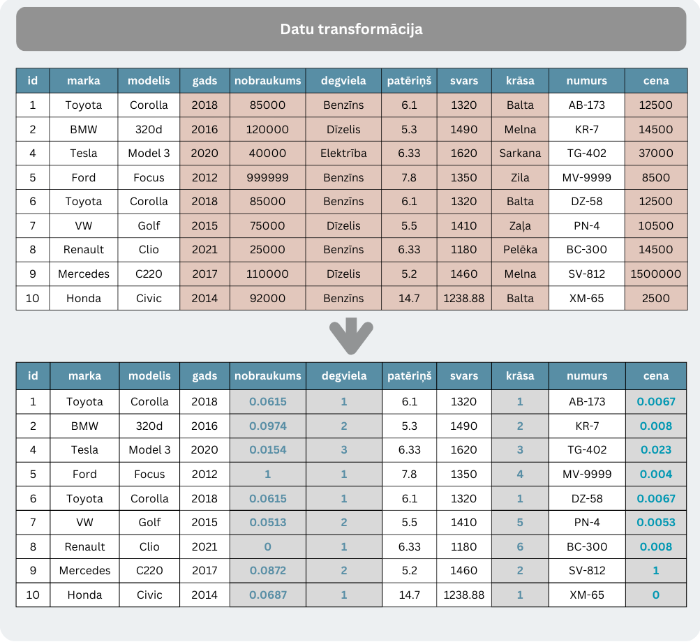Transformācijas piemērs (attēlā redzama datu diapazona vienādošana, kas ir nepieciešama pirms MI algoritmu apmācības un citos gadījumos)