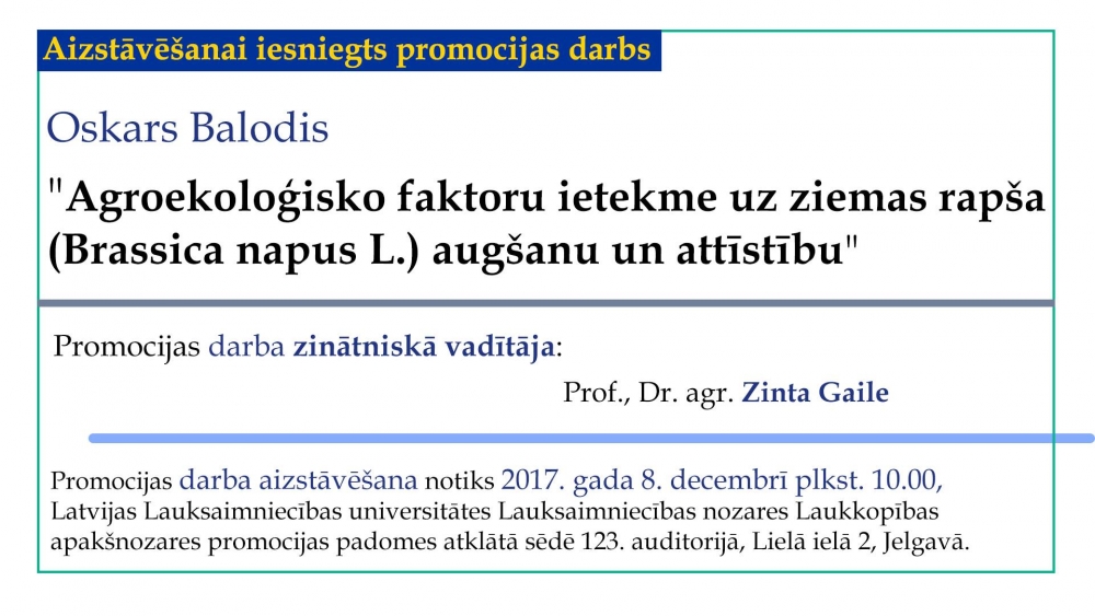 Promocijas darbs "Agroekoloģisko faktoru ietekme uz ziemas rapša (Brassica napus L.) augšanu un attīstību"