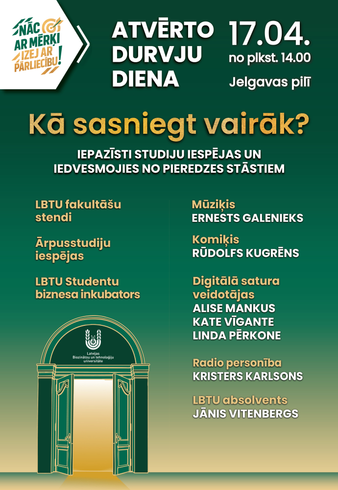17. aprīlī no plkst. 14.00 līdz plkst. 17.00 Jelgavas pilī (Lielā iela 2, Jelgava) norisināsies Latvijas Biozinātņu un tehnoloģiju universitātes (LBTU) Atvērto durvju diena "Kā sasniegt vairāk?". Šī būs tava iespēja iepazīt LBTU pavisam citādā – iedvesmojošā, dzīvespriecīgā un studentiskā – gaisotnē. Uzzini visu par studiju iespējām, izstaigā fakultātes, izpēti ārpusstudiju dzīvi un piedalies aizraujošās aktivitātēs.