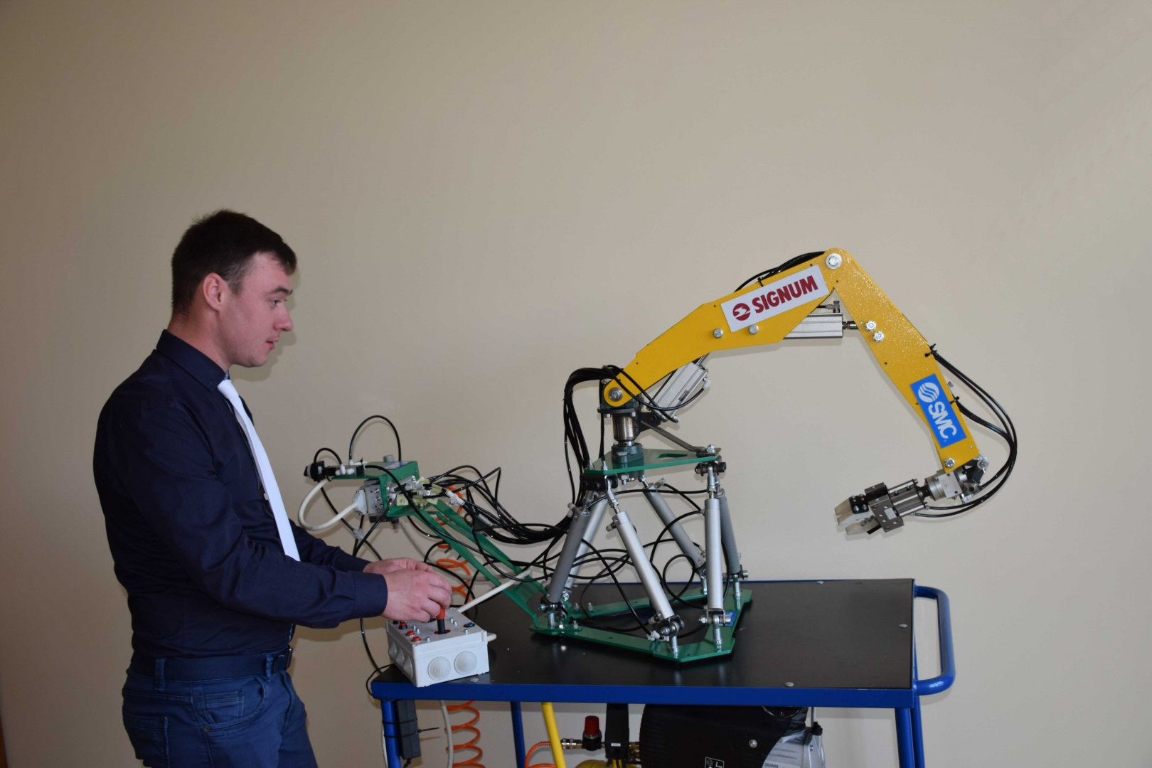Izveidotais modelis ir paredzēts pneimatisko un mehānisko sistēmu demonstrēšanai un tiks izmantots studiju procesā, kā arī būs apskatāms izstādēs un dažādos pasākumos. Tam ir vismaz divas būtiskas priekšrocības. Pirmkārt, tas tiks izmantots pneimatikas un mehatronikas pamatu apguvei. LLU Tehniskās fakultātes studenti laboratorijas darbos varēs veidot dažādas shēmas mehānisma darbināšanai un kustības ātruma regulēšanai, jo manipulatorā ir iebūvēti dažādi pneimatikas elementi (dažāda veida cilindri, satvērējs, rotators, ātruma regulatori un sadalītāji).