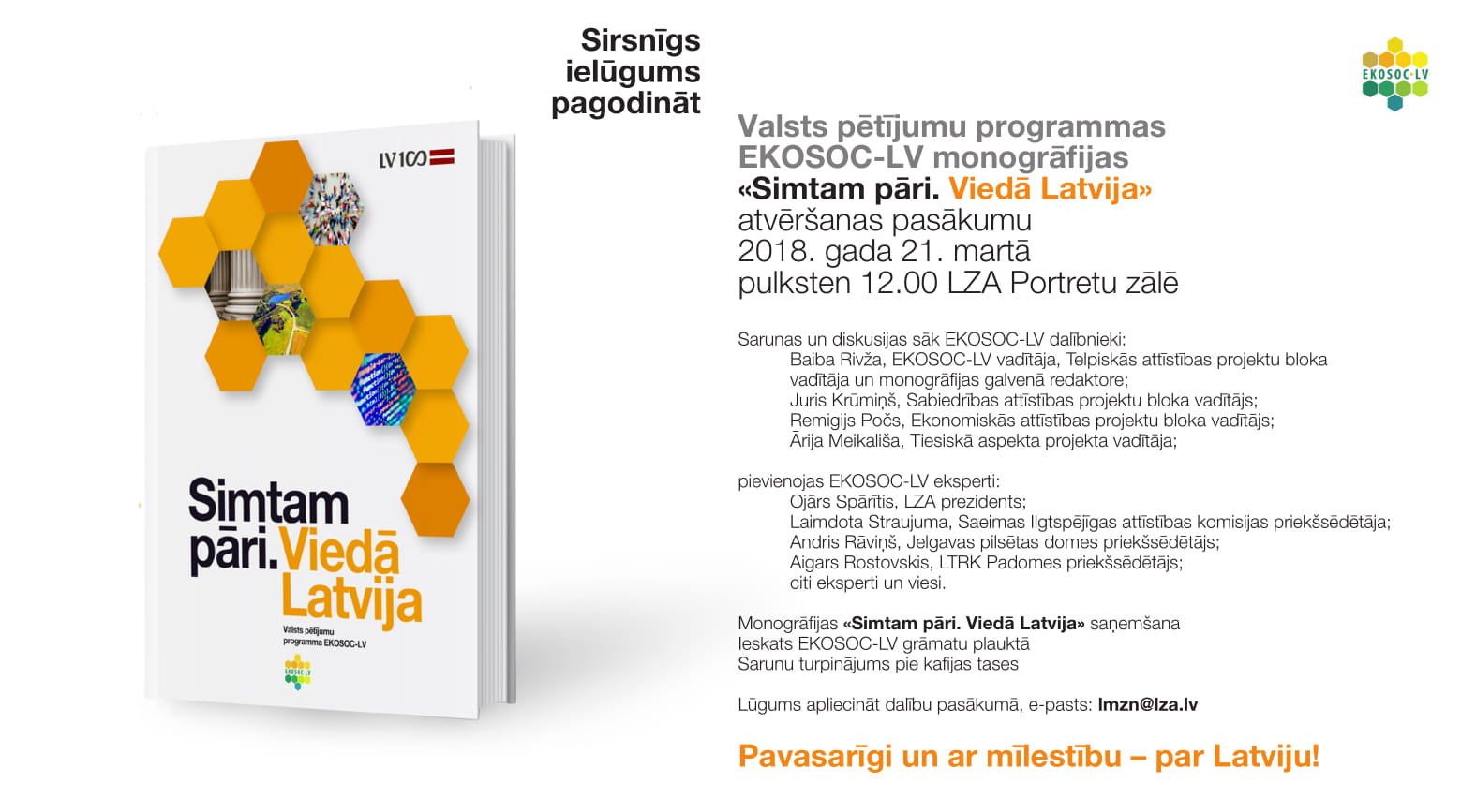 21. martā plkst. 12.00 Latvijas Zinātņu akadēmijas (LZA) Portretu zālē norisināsies valsts pētījumu programmas (VPP) EKOSOC-LV monogrāfijas “Simtam pāri. Viedā Latvija” atvēršanas pasākums, kurā būs sarunas un diskusijas ar Baibu Rivžu (EKOSOC-LV vadītāju un monogrāfijas galveno redaktori), LLU pētniekiem un ekspertiem - Ojāru Spārīti (LZA prezidentu), Laimdotu Straujumu (Saeimas Ilgtspējīgas attīstības komisijas priekšsēdētāju), Andri Rāviņu (Jelgavas pilsētas domes priekšsēdētāju), Aigaru Rostovski (LTRK Padomes priekšsēdētāju), kā arī citiem ekspertiem un viesiem.