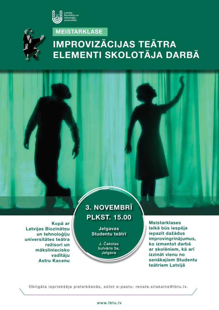 3. novembrī plkst. 15.00 – 17.00 Latvijas Biozinātņu un tehnoloģiju universitāte – LBTU (iepriekš Latvijas Lauksaimniecības universitāte - LLU) aicina Jelgavas skolu pedagogus piedalīties meistarklasē “Improvizācijas teātra elementi skolotāja darbā”, kas norisināsies unikālā vietā – Jelgavas Studentu teātrī, J. Čakstes bulvārī 5a.