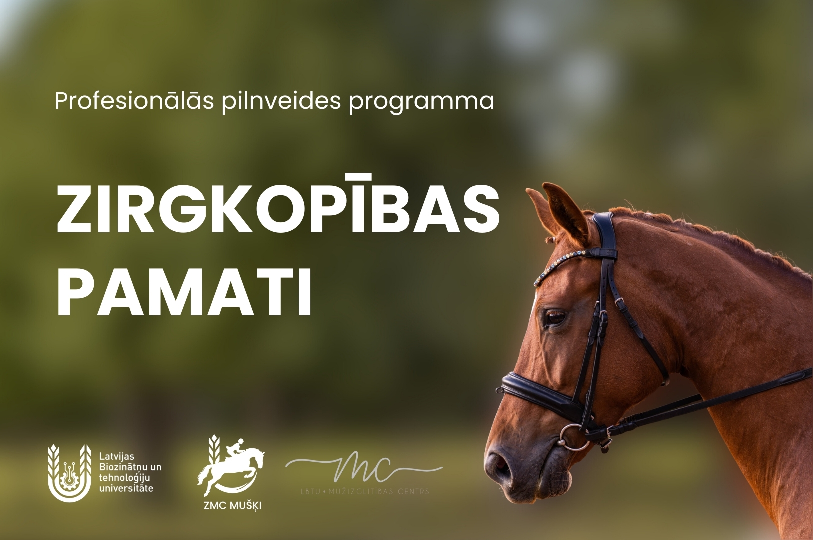 Latvijas Biozinātņu un tehnoloģiju universitātes (LBTU) Lauksaimniecības un pārtikas tehnoloģijas fakultātes Zirgkopības mācību centrs "Mušķi" sadarbībā ar Mūžizglītības centru aicina piedalīties profesionālās pilnveides izglītības programmā "Zirgkopības pamati", kas sniedz padziļinātas teorētiskās zināšanas un praktiskās iemaņas zirgkopības nozarē. Mācību sākums plānots no 10. janvāra, ja tiks nokomplektēta mācību grupa.